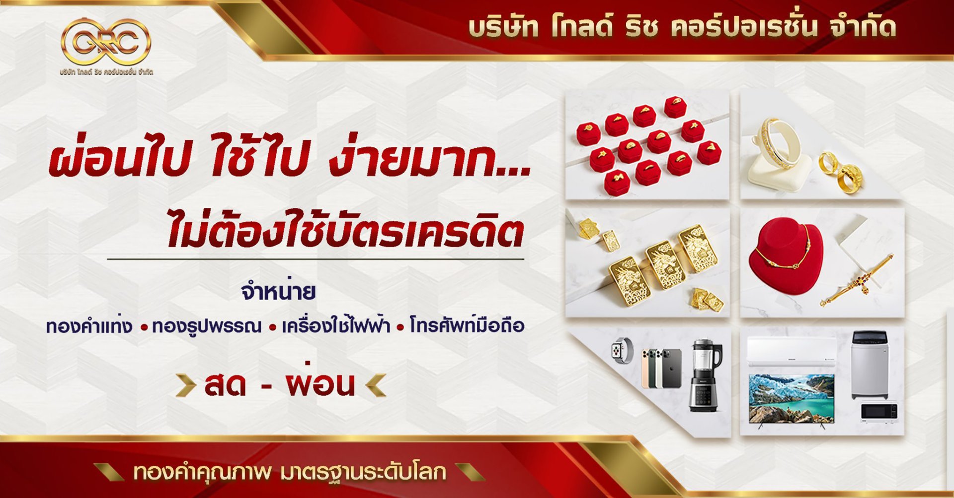 บริษัทโกลด์ ริช คอร์ปอเรชั่น จำกัด มีบริการผ่อนทองคำ 96.5% หลากหลายรูปแบบ ทั้งทองคำแท่ง ทองคำรูปพรรณไม่ว่าจะเป็น สร้อยคอทอง สร้อยข้อมือทอง แหวนทอง ฯลฯ ลูกค้ามั่นใจได้ว่าทองคำที่ได้รับเป็นทองคำที่มีคุณภาพได้มาตรฐาน โดยอ้างอิงราคาทองคำในแต่ละวัน ลูกค้าที่ผ่อนทองกับเราจะได้รับทองในวันทำสัญญาทันที มีบริการทำสัญญาถึงบ้านไม่ต้องเดินทางมาที่ร้าน สะดวก สบาย เมื่อใช้บริการผ่อนทองกับเรา